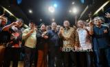 Aktivis peristiwa 15 Januari 1974 atau Malari, Hariman Siregar (tengah), mantan Panglima TNI Gatot Nurmayanto (ketiga kanan) dan Pengamat Militer Connie Rahakundini Bakrie (ketiga kiri) berfoto bersama aktivis lainnya saat peringatan 50 tahun peristiwa 15 Januari 1974 (Malari) di Teater Kecil, Taman Ismail Marzuki, Jakarta, Senin (15/1/2024). Peringatan Malari tersebut digelar bersamaan dengan perayaan HUT ke-24 Indonesia Demokrasi Monitor (Indemo) yang mengangkat tema The Last Battle Democracy dan Lawan Politik Dinasti. (FOTO : Republika/Thoudy Badai)