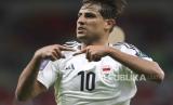 Pemain timnas Irak Mohanad Ali Kadhim melakukan selebrasi seusai mencetak gol pada pertandingan sepak bola Grup D Piala Asia antara Indonesia dan Irak di Stadion Ahmad Bin Ali di Al Rayyan, Qatar, Senin (15/1/2024). Pada pertandingan itu Indonesia harus mengakui keunggulan Irak dengan skor 1-3. (FOTO : AP Photo/Hussein Sayed)