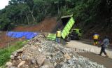 Pekerja menurunkan material kerikil untuk perbaikan ruas jalan lintas Bengkulu-Sumatera Selatan KM44 di Kabupaten Bengkulu Tengah, Bengkulu, Selasa (16/1/2024). Jalan lintas yang menghubungkan Provinsi Bengkulu-Kota Lubuklinggau Provinsi Sumsel tersebut amblas akibat curah hujan yang tinggi dan saat ini dalam tahap pelebaran sementara oleh Badan Pelaksana Jalan Nasional (BPJN) wilayah Bengkulu. (FOTO : ANTARA FOTO/Muhammad Izfaldi)