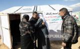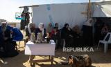 Kerabat perempuan dari warga Palestina yang baru menikah, Mohamed dan istrinya Abed (tidak dalam gambar) duduk untuk berbagi kopi sebagai perayaan pernikahan sederhana mereka di Rafah, (15/1/2024). (FOTO : EPA)