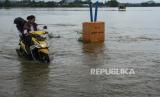Pengendara motor menerobos banjir di Desa Borong Palala, Kabupaten Gowa, Sulawesi Selatan, Rabu (17/1/2024). Tingginya intensitas curah hujan beberapa hari terakhir mengakibatkan area persawahan dan akses jalan desa di daerah itu terendam banjir. (FOTO : ANTARA FOTO/Arnas Padda)