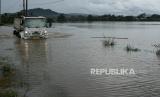 Mobil truk melintasi banjir di Desa Borong Palala, Kabupaten Gowa, Sulawesi Selatan, Rabu (17/1/2024). Tingginya intensitas curah hujan beberapa hari terakhir mengakibatkan area persawahan dan akses jalan desa di daerah itu terendam banjir. (FOTO : ANTARA FOTO/Arnas Padda)