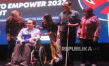 British Charge d Affaires to Indonesia and Timor-Leste Matthew Downing, Peserta Disabilitas, Co-Founder Alunjiva Indonesia Fany Efrita serta Direktur Bina Penempatan Tenaga Kerja Dalam Negeri Kementerian Ketenagakerjaan Republik Indonesia Kustiati (dari kiri) berbincang saat penyelenggaraan Tech to Empower Summit ketiga di Taman Ismail Marzuki, Kamis, (18/1/2024). (FOTO : Dok.Republika)