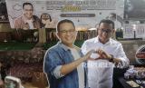 Calon Presiden nomor urut 1 Anies Baswedan berfoto dengan standing banner bergambar dirinya saat mengunjungi food truck yang dihadirkan oleh Olppaemi Project di Jakarta, Kamis (18/1/2024). Mobil kiriman Olppaemi Project yang merupakan fandom k-popers tersebut membawa bingkisan makanan yang nantinya dibagi-bagikan kepada para pendukung Anies. Tak hanya makanan, Olppaemi Project juga menyediakan souvenir berupa photocard, sticker, dan standing banner bergambar Anies. (FOTO : Republika/Putra M. Akbar)