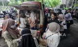 Simpatisan mengantre untuk mengambil makanan pada food truck yang dihadirkan oleh Olppaemi Project di Jakarta, Kamis (18/1/2024). Mobil kiriman Olppaemi Project yang merupakan fandom k-popers tersebut membawa bingkisan makanan yang nantinya dibagi-bagikan kepada para pendukung Anies. Tak hanya makanan, Olppaemi Project juga menyediakan souvenir berupa photocard, sticker, dan standing banner bergambar Anies. (FOTO : Republika/Putra M. Akbar)