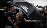 Pegiat HAM Sumarsih mengikuti aksi 17 Tahun Kamisan di depan Istana Merdeka, Jakarta, Kamis (18/1/2024). Mereka menyoroti narasi isu pelanggaran HAM yang muncul lima tahun sekali saat pemilihan presiden merupakan bentuk penyebaran disinformasi serta mendiskreditkan perjuangan korban, keluarga korban, pegiat HAM serta publik yang selama puluhan tahun menuntut keadilan. (FOTO : Republika/Edwin Dwi Putranto)