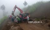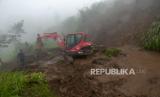 REPUBLIKA.CO.ID, BOYOLALI -- Petugas Badan Penanggulangan Bendana Daerah (BPBD) Kabupaten Boyolali menggunakan alat berat membersihkan tanah longsor yang menutupi jalur wisata Solo-Selo-Borobudur (SSB) di Selo, Boyolali, Jawa Tengah, Jumat (19/1/2024). Curah hujan tinggi yang melanda di Kabupaten Boyolali mengakibatkan tanah longsor di sejumlah titik kawasan tersebut.