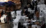 REPUBLIKA.CO.ID, SURABAYA -- Sejumlah pekerja melakukan pengemasan surat suara ke dalam kotak suara di gudang logistik pemilu KPU Kota Surabaya di Margomulyo, Surabaya, Jawa Timur, Sabtu (20/1/2024).