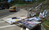 REPUBLIKA.CO.ID, CIANJUR -- Baliho kampanye capres, cawapres, para caleg rusak dan tumbang tertiup angin di daerah Cipanas, Kabupaten Cianjur, Sabtu (19/1/2024). Baliho rusak itu menggangu keindahan lokasi dan menjadi sampah yang mengotori tempat itu.