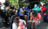 Warga antre untuk mendapatkan layanan imunisasi polio bagi anaknya saat Hari Bebas Kendaraan Bermotor (Car Free Day) di Taman Bungkul Surabaya, Jawa Timur, Ahad (21/1/2024). Imunisasi polio yang dilakukan dengan menyasar kepada anak-anak yang belum terimunisasi polio tersebut sebagai upaya menyukseskan program pemerintah dalam menanggulangi kejadian luar biasa (KLB). (FOTO : ANTARA FOTO/Didik Suhartono)
