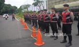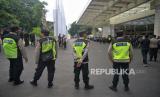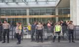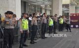 Petugas kepolisian berjaga di lokasi debat ke empat Pilpres 2024 di Jakarta Convention Center (JCC), Senayan, Jakarta, Ahad (21/1/2024). Polda Metro Jaya menerjunkan 2.000 personel untuk mengamankan acara debat kedua Calon Wakil Presiden (Cawapres) yang digelar Komisi Pemilihan Umum (KPU). (FOTO : Republika/Prayogi)