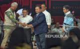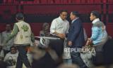 Capres nomor urut 1 Anies Baswedan  berjabat tangan dengan Capres nomor urut 2 Prabowo Subianto usai Debat Keempat Pilpres 2024 di Jakarta Convention Center (JCC), Jakarta, Ahad (21/1/2024). Debat Keempat Pilpres 2024 mengangkat tema terkait pembangunan berkelanjutan, sumber daya alam, lingkungan hidup, energi, pangan, agraria, masyarakat adat dan desa (FOTO : Republika/Prayogi)