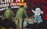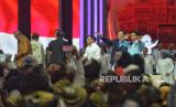 Capres-cawapres nomor urut 2 Prabowo Subianto  dan Gibran Rakabuming Raka usai Debat Keempat Pilpres 2024 di Jakarta Convention Center (JCC), Jakarta, Ahad (21/1/2024). Debat Keempat Pilpres 2024 mengangkat tema terkait pembangunan berkelanjutan, sumber daya alam, lingkungan hidup, energi, pangan, agraria, masyarakat adat dan desa. (FOTO : Republika/Prayogi)