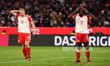 Dayot Upamecano (kanan) dari Munich dan Matthijs de Ligt (kiri) dari Munich bereaksi selama pertandingan sepak bola Bundesliga Jerman antara FC Bayern Munich dan Werder Bremen di Munich, Jerman, Ahad (21/1/2024). (FOTO : EPA)