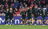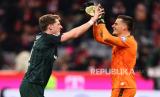 Jens Stage (kiri) Bremen dan kiper Bremen Michael Zetterer (kanan) merayakan kemenangan usai memenangi pertandingan sepak bola Bundesliga Jerman antara FC Bayern Munich dan Werder Bremen di Munich, Jerman, Ahad (21/1/2024). (FOTO : EPA)