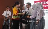 Kepala Eksekutif Pengawas Perilaku Pelaku Usaha Jasa Keuangan, Edukasi, dan Perlindungan Konsumen OJK Friderica Widyasari Dewi (tengah) memberikan cinderamata untuk pelajar saat Kegiatan Edukasi Keuangan di Indonesia Banking School, Jakarta, Senin (22/1/2024). Otoritas Jasa Keuangan (OJK) menyelenggarakan kegiatan Edukasi Keuangan terkait investasi, pinjaman hingga perencanaan keuangan yang diikuti sekitar 1500 pelajar secara luring dan daring guna meningkatkan literasi keuangan masyarakat khususnya bagi pelajar. (FOTO : Republika/Putra M. Akbar)