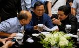 Calon presiden nomor urut 2 Prabowo Subianto (tengah) bersama Ketua Tim Kampanye Nasional (TKN) Prabowo-Gibran Roslan Roeslani (kiri) dan Erick Thohir (kedua kanan) dan Garibaldi Thohir (kedua kiri) berbincang saat menghadiri acara Relawan Erick Thohir alumni Amerika Serikat for 02 (ETAS) di Plaza Senayan, Jakarta, Senin (22/1/2024). ETAS mendeklarasikan dukungan terhadap pasangan calon presiden dan wakil presiden nomor urut 2 Prabowo Subianto dan Gibran Rakabuming Raka pada Pemilu 2024. (FOTO : Republika/Thoudy Badai)