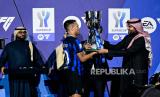 Lautaro Martinez dari Inter menerima trofi setelah memenangkan Supercoppa Italiana, Piala Super Italia, pertandingan final antara SSC Napoli dan Inter Milan, di Riyadh, Arab Saudi, (22/1/2024). (FOTO : EPA-EFE/STRINGER)