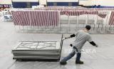 Petugas pemilu mempersiapkan tempat pemungutan suara di Londonderry High School pada malam pemilihan pendahuluan di New Hampshire, di Londonderry, New Hampshire, AS, (22/1/2024). (FOTO : EPA)