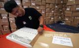 Pekerja melakukan pengepakan template alat bantu memilih untuk tunanetra surat suara DPD RI yang menggunakan huruf braille di gudang logistik KPU Tangsel, Serpong, Tangerang Selatan, Banten, Selasa (23/1/2024). KPU Tangsel mulai mendistribusikan template alat bantu pemilih tunanetra sebanyak 3.824 buah, ke seluruh tempat pemungutan suara (TPS) se- Kota Tangerang Selatan, guna mempermudah penyandan tunanetra memenuhi hak pilihnya pada pemilu 2024. (FOTO : ANTARA FOTO/Muhammad Iqbal)