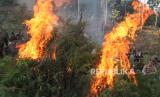 Personel gabungan BNN, TNI/Polri membakar tanaman ganja dalam operasi pemusnahan ladang ganja di Desa Teupin Rusep, Kecamatan Sawang, Aceh Utara, Aceh, Selasa (23/1/2024). Dalam operasi itu petugas menemukan ladang ganja seluas 2 hektare atau sekitar 22.000 batang pohon ganja siap panen, diperkirakan seberat 10 ton yang kemudian dimusnahkan dengan cara dibakar. (FOTO : ANTARA FOTO/Rahmad)