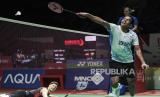 Pebulu tangkis tunggal putra Indonesia Chico Aura Dwi Wardoyo gagal mengembalikan kok ke arah pebulu tangkis tunggal putra Denmark Anders Antonsen pada pertandingan babak pertama (32 besar) turnamen Daihatsu Indonesia Masters 2024 di Istora Senayan, Gelora Bung Karno, Jakarta, Rabu (24/1/2024). Pada pertandingan tersebut Chico kalah dari Antonsen dengan skor akhir 15-21 dan 10-21. (FOTO : Republika/Putra M. Akbar)