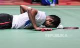 Pebulu tangkis tunggal putra Indonesia Chico Aura Dwi Wardoyo saat gagal mengembalikan kok ke arah pebulu tangkis tunggal putra Denmark Anders Antonsen pada pertandingan babak pertama (32 besar) turnamen Daihatsu Indonesia Masters 2024 di Istora Senayan, Gelora Bung Karno, Jakarta, Rabu (24/1/2024). Pada pertandingan tersebut Chico kalah dari Antonsen dengan skor akhir 15-21 dan 10-21. (FOTO : Republika/Putra M. Akbar)