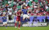 Japan Wataru Endo heads the ball past Indonesia Ivar Jenner during the Asian Cup Group D soccer match between Japan and Indonesia at Al Thumama in Doha, Qatar, Wednesday, Jan. 24, 2024. (FOTO : AP Photo/Thanassis Stavrakis)