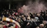 Pendukung Liverpool merayakan usai berakhirnya pertandingan sepak bola leg kedua semifinal Piala Liga Inggris antara Fulham dan Liverpool, di stadion Craven Cottage di London, Inggris, Kamis (25/1/2024) dini hari WIB (FOTO : AP)