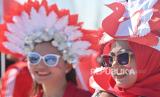 REPUBLIKA.CO.ID, DOHA. -- Sejumlah suporter Indonesia memberi dukungan kepada Timnas Indonesia yang bertanding melawan Timnas Jepang pada pertandingan penentu grup D Piala Asia 2023 di Stadion Al Thumama, Doha, Qatar, Rabu (24/1/2024).