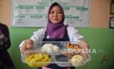 Ibu kader posyandu menunjukan Makanan Pendamping ASI (MPASI) disela acara seminar gizi dan live cooking bertema Optimalisasi Pangan Lokal di Depok, Jawa Barat, Kamis (25/1/2024). Dalam rangka memperingati Hari Gizi Nasional (HGN), Rumah Zakat berkolaborasi dengan BKKBN dan Bumbu Bunda Elia menggelar acara tersebut guna memberikan edukasi kepada masyarakat agar bisa mengoptimalisasi bahan pangan yang ada di lingkungan sekitarnya agar menjadi asupan gizi bagi keluarga. (FOTO : Republika/Prayogi)