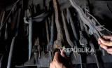 Empu kehormatan Keraton Kasunanan Surakarta Hadiningrat, KRT Subandi Suponingrat (kiri) dibantu pekerja membuat senjata keris pusaka di Omah Keris Palur, Karanganyar, Jawa Tengah, Kamis (25/1/2024). Produksi keris pusaka tersebut membutuhkan waktu pengerjaan selama sebulan untuk dipasarkan ke sejumlah daerah maupun mancanegara dengan harga Rp3 juta hingga Rp20 juta per buah tergantung bahan dan tingkat kesulitan. (FOTO : ANTARAFOTO/Maulana Surya)