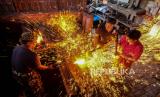 REPUBLIKA.CO.ID, KARANGANYAR-- Empu kehormatan Keraton Kasunanan Surakarta Hadiningrat, KRT Subandi Suponingrat (kiri) dibantu pekerja membuat senjata keris pusaka di Omah Keris Palur, Karanganyar, Jawa Tengah, Kamis (25/1/2024).
