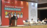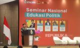 Rektor Unika Atma Jaya Yuda Turana berbicara dalam Seminar Edukasi Politik di Unika Atmajaya Semanggi, Jakarta, Jumat (26/1/2024). (FOTO : Dok.Republika)