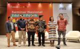 Dosen Fakultas Ilmu Administrasi Bisnis dan Ilmu Komunikasi (FIABIKOM) Unika Atma Jaya Salvatore Simarmata, Peneliti Litbang Kompas Vincentius Gitiyarko Priyatno, Praktisi Hukum Cornelius Beny Juniarto, Rektor Unika Atma Jaya Yuda Turana, Peneliti FORMAPPI Elisabeth Kusrini, Research Fellow IFAR UAJ Muhammad Fajar (dari kiri) saat menjadi narasumber dalam Seminar Edukasi Politik di Unika Atmajaya Semanggi, Jakarta, Jumat (26/1/2024). (FOTO : Dok.Republika)