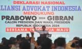 Ratusan pengacara yang tergabung dalam Aliansi Advokat Indonesia siap memberikan pendampingan hukum sebagai bentuk dukungan kepada pasangan calon Prabowo Subianto-Gibran Rakabuming Raka.