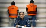 Kepala pemberitaan KPK Ali Fikri memberikan keterangan pers terkait penetapan dan penahanan dua tersangka baru kasus suap pengadaan barang dan jasa di lingkup Pemkab Labuhanbatu, Sumatra Utara yakni anggota DPRD Labuhanbatu Yusrial Suprianto Pasaribu (belakang kiri) dan pihak swasta Wahyu Ramdhani Siregar (belakang kanan) di Gedung Merah Putih KPK, Jakarta, Jumat (26/1/2023). Kasus ini merupakan tindak lanjut dari operasi tangkap tangan (OTT) yang dilakukan KPK di wilayah Kabupaten Labuhanbatu yang melibatkan Bupatinya Erik Adtrada Ritonga. ANTARA FOTO/Muhammad Iqbal/Spt. (FOTO : ANTARA FOTO/Muhammad Iqbal)