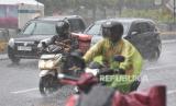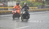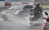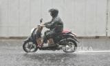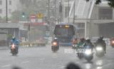 Pengendara menerobos hujan lebat yang mengguyur di Kawasan Jalan MH Thamrin, Jakarta, Sabtu (27/1/2024). Badan Meteorologi Klimatologi dan Geofisika (BMKG) menerbitkan peringatan dini cuaca buruk di wilayah Jakarta dan sekitarnya. Disebutkan bahwa warga di wilayah Jakarta Pusat dan Kepulaan Seribu diminta mewaspadai cuaca ekstrim hujan disertai kilat atau petir pada dini hari. Hal serupa juga diperkirakan akan terjadi di wilayah Jakarta Selatan dan Jakarta Timur pada sore harinya. Hujan ringan dan sedang serta berawan baik tebal diperkirakan akan memayungi wilayah-wilayah itu sepanjang Sabtu. (FOTO : Republika/Prayogi)