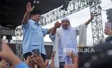 Calon presiden nomor urut 2 Prabowo Subianto (kiri) menggandeng tangan tokoh agama Habib Lutfi bin Yahya (kanan) saat menghadiri kampanye di Stadion Maulana Yusuf, Serang, Banten, Sabtu (27/1/2024). Di sela-sela kampanye Prabowo menerima dukungan dari sejumlah relawan santri dan ulama Banten. (FOTO : ANTARA FOTO/Asep Fathulrahman)