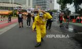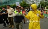 Petugas Satpol PP mengumumkan batas waktu gelaran aksi dari Koalisi Primates Fight Back saat Hari Bebas Kendaraan Bermotor (HBKB) di kawasan Bundaran HI, Jakarta, Ahad (28/1/2024). Aksi tersebut dalam rangkaian Hari Primata Indonesia yang diperingati pada 30 Januari besok dengan mensosialisasikan sekaligus penyadartahuan kepada masyarakat tentang isu eksploitasi monyet. Selain itu, mereka juga menuntut Menteri Lingkungan Hidup dan Kehutanan untuk menetapkan monyet ekor panjang dan beruk sebagai satwa dilindungi. (FOTO : Republika/Thoudy Badai)