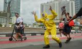 Seniman Pantomim Wanggi Hoed bersama Koalisi Primates Fight Back menggelar aksi teatrikal saat Hari Bebas Kendaraan Bermotor (HBKB) di kawasan Bundaran HI, Jakarta, Ahad (28/1/2024). Aksi tersebut dalam rangkaian Hari Primata Indonesia yang diperingati pada 30 Januari besok dengan mensosialisasikan sekaligus penyadartahuan kepada masyarakat tentang isu eksploitasi monyet. Selain itu, mereka juga menuntut Menteri Lingkungan Hidup dan Kehutanan untuk menetapkan monyet ekor panjang dan beruk sebagai satwa dilindungi. (FOTO : Republika/Thoudy Badai)