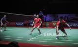 Pebulu tangkis Ganda Campuran Cina Zheng Si Wei (kanan) dan Huang Ya Qiong (kiri) mengembalikan kok ke arah pebulu tangkis ganda campuran Jepang Hiroki Midorikawa dan Natsu Saito pada babak final Daihatsu Indonesia Masters 2024 di Istora Senayan, Gelora Bung Karno (GBK), Jakarta, Ahad (28/1/2024). Zheng Si Wei dan Huang Ya Qiong menjadi juara ganda campuran pada turnamen bulu tangkis Daihatsu Indonesia Masters 2024 usai menang dengan skor 21-15, 21-16. (FOTO : Republika/Putra M. Akbar)