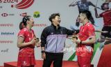 Pebulu tangkis Ganda Campuran Cina Zheng Si Wei (kanan) dan Huang Ya Qiong (kiri) bersama legenda bulu tangkis Indonesia Liliyana Natsir berbincang usai turnamen final Daihatsu Indonesia Masters 2024 di Istora Senayan, Gelora Bung Karno (GBK), Jakarta, Ahad (28/1/2024). Zheng Si Wei dan Huang Ya Qiong menjadi juara ganda campuran pada turnamen bulu tangkis Daihatsu Indonesia Masters 2024 usai menang dengan skor 21-15, 21-16. (FOTO : Republika/Putra M. Akbar)