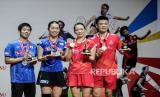 Pebulu tangkis Ganda Campuran Cina Zheng Si Wei (kanan) dan Huang Ya Qiong (kedua kanan) bersama ganda campuran Jepang Hiroki Midorikawa (kiri) dan Natsu Saito (kedua kiri) mengangkat medali usai babak final Daihatsu Indonesia Masters 2024 di Istora Senayan, Gelora Bung Karno (GBK), Jakarta, Ahad (28/1/2024). Zheng Si Wei dan Huang Ya Qiong menjadi juara ganda campuran pada turnamen bulu tangkis Daihatsu Indonesia Masters 2024 usai menang dengan skor 21-15, 21-16. (FOTO : Republika/Putra M. Akbar)