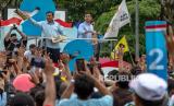 Calon presiden dan calon wakil presiden nomor urut 2, Prabowo Subianto (kiri) dan Gibran Rakabuming Raka (kanan) membagikan kaus kepada pendukungnya saat menggelar kampanye akbar bertajuk kirab kebangsaan di Semarang, Jawa Tengah, Ahad (28/1/2024). Dalam orasi politiknya Prabowo berjanji dan bertekad akan memaksimalkan pengelolaan kekayaan alam Indonesia yang melimpah untuk mensejahterakan seluruh rakyat Indonesia agar tidak ada lagi kemiskinan di Indonesia. (FOTO : ANTARA FOTO/Aji Styawan)
