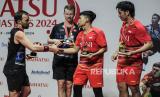 Pebulu tangkis ganda putra Indonesia Leo Rolly Carnando (kedua kanan) dan Daniel Marthin (kanan) bersalaman dengan pebulu tangkis ganda putra Denmark Kim Astrup (kedua kiri) dan Anders Skaarup Rasmussen (kiri) usai pertandingan pada babak final Daihatsu Indonesia Masters 2024 di Istora Senayan, Gelora Bung Karno (GBK), Jakarta, Ahad (28/1/2024). Leo Rolly Carnando dan Daniel Marthin menjadi juara ganda putra pada turnamen bulu tangkis Daihatsu Indonesia Masters 2024 usai menang dengan skor 21-12, 20-22, 21-11. (FOTO : Republika/Putra M. Akbar)