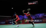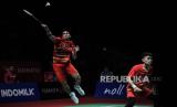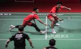 Pebulu tangkis ganda putra Indonesia Leo Rolly Carnando (kanan) dan Daniel Marthin (kiri) mengembalikan kok ke arah pebulu tangkis ganda putra Denmark Kim Astrup dan Anders Skaarup Rasmussen pada babak final Daihatsu Indonesia Masters 2024 di Istora Senayan, Gelora Bung Karno (GBK), Jakarta, Ahad (28/1/2024). Leo Rolly Carnando dan Daniel Marthin menjadi juara ganda putra pada turnamen bulu tangkis Daihatsu Indonesia Masters 2024 usai menang dengan skor 21-12, 20-22, 21-11. (FOTO : Republika/Putra M. Akbar)