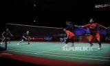Pebulu tangkis ganda putra Indonesia Leo Rolly Carnando (kiri atas) dan Daniel Marthin (kanan atas) mengembalikan kok ke arah pebulu tangkis ganda putra Denmark Kim Astrup dan Anders Skaarup Rasmussen pada babak final Daihatsu Indonesia Masters 2024 di Istora Senayan, Gelora Bung Karno (GBK), Jakarta, Ahad (28/1/2024). Leo Rolly Carnando dan Daniel Marthin menjadi juara ganda putra pada turnamen bulu tangkis Daihatsu Indonesia Masters 2024 usai menang dengan skor 21-12, 20-22, 21-11. (FOTO : Republika/Putra M. Akbar)