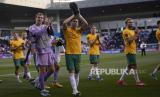 Pemain Australia memberikan salam seusai pertandingan sepak bola babak 16 besar Piala Asia antara Australia dan Indonesia di Stadion Jassim Bin Hamad di Doha, Qatar, Ahad (28/1/2024). Indonesia harus mengakui keunggulan Australia setelah kalah 0-4 di babak 16 besar Piala Asia. (FOTO : AP Photo/Aijaz Rahi)