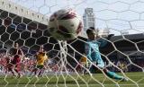 Penjaga gawang Indonesia Ernando Ari Sutaryadi gagal menghalau bola saat pertandingan sepak bola babak 16 besar Piala Asia antara Australia dan Indonesia di Stadion Jassim Bin Hamad di Doha, Qatar, Ahad (28/1/2024). Indonesia harus mengakui keunggulan Australia setelah kalah 0-4 di babak 16 besar Piala Asia. (FOTO : AP Photo/Aijaz Rahi)